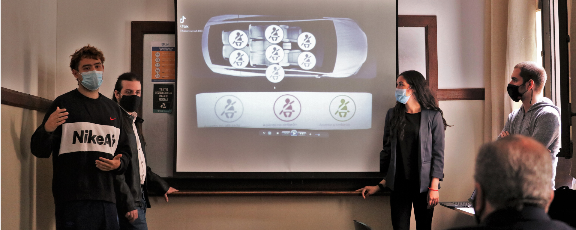 Estudiantes de la Facultad de Ingeniería de la UM (FIUM) presentaron este martes 16 de noviembre dos proyectos apoyados por la Unidad Nacional de Seguridad Vial (UNASEV), que tienen como fin introducir un dispositivo dentro del vehículo que ayude a evitar siniestros graves. Participaron del evento el secretario general de UNASEV, Jorge Alfaro, y la ingeniera asesora en UNASEV, Agustina Sosa. Los docentes a cargo fueron: Nicolás Sosa y Diego Durán.